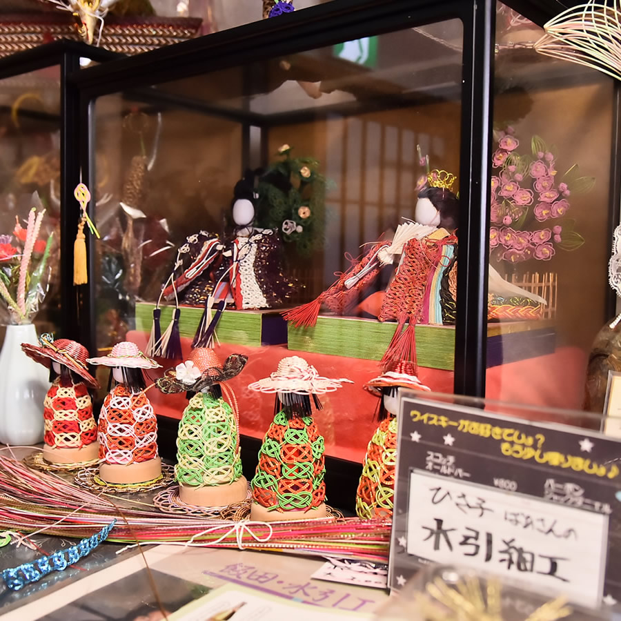 吊るし雛や、南信地方で有名な水引を使って作った雛飾りなど珍しいお雛飾りが並びます。